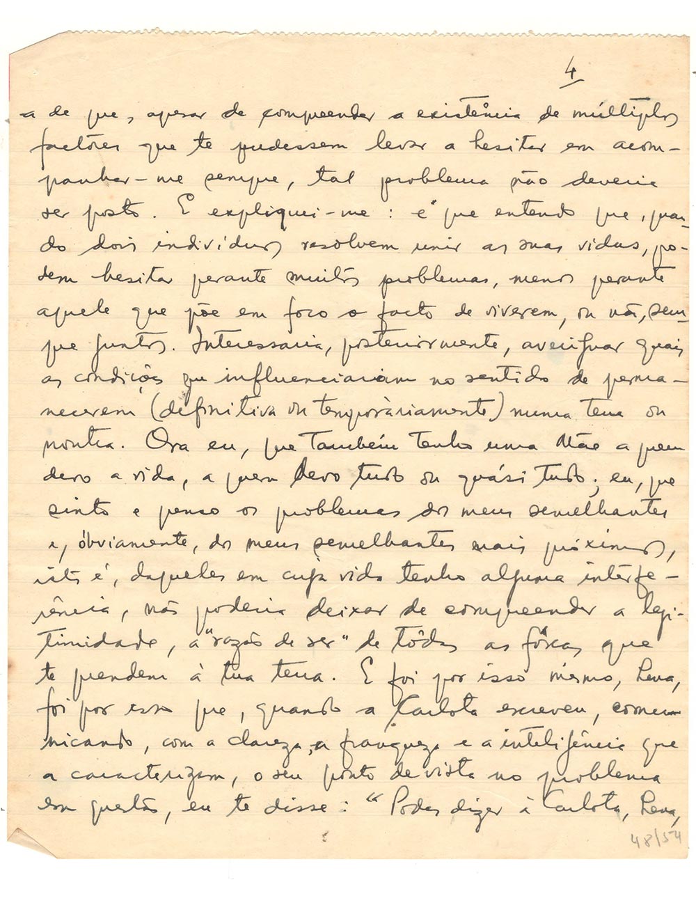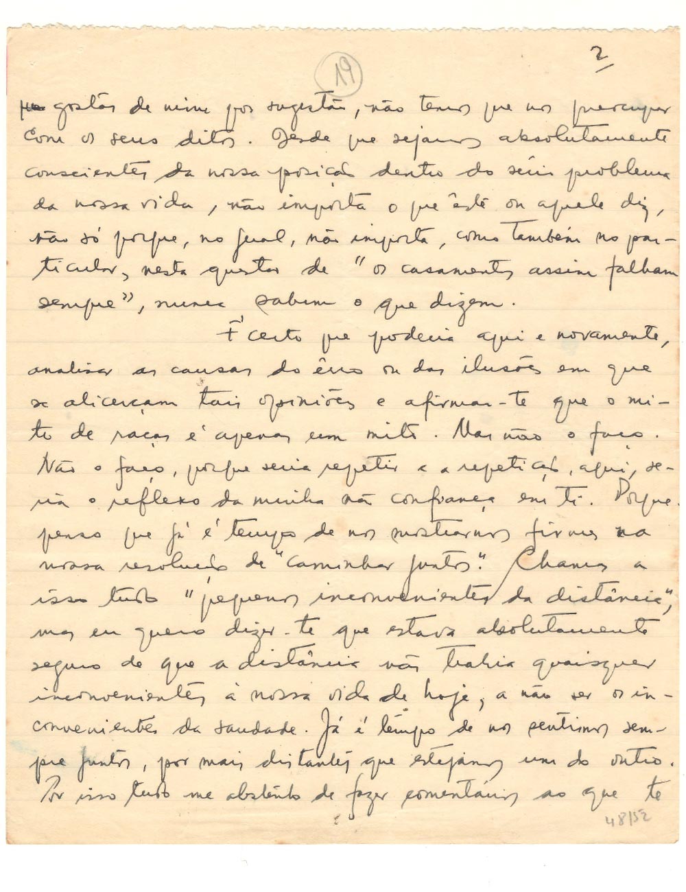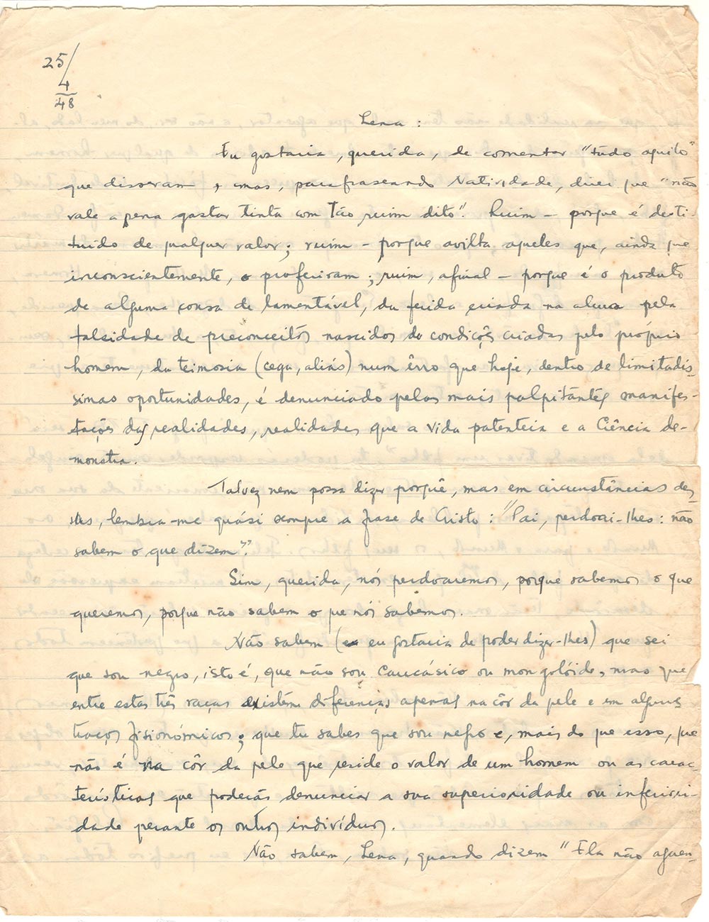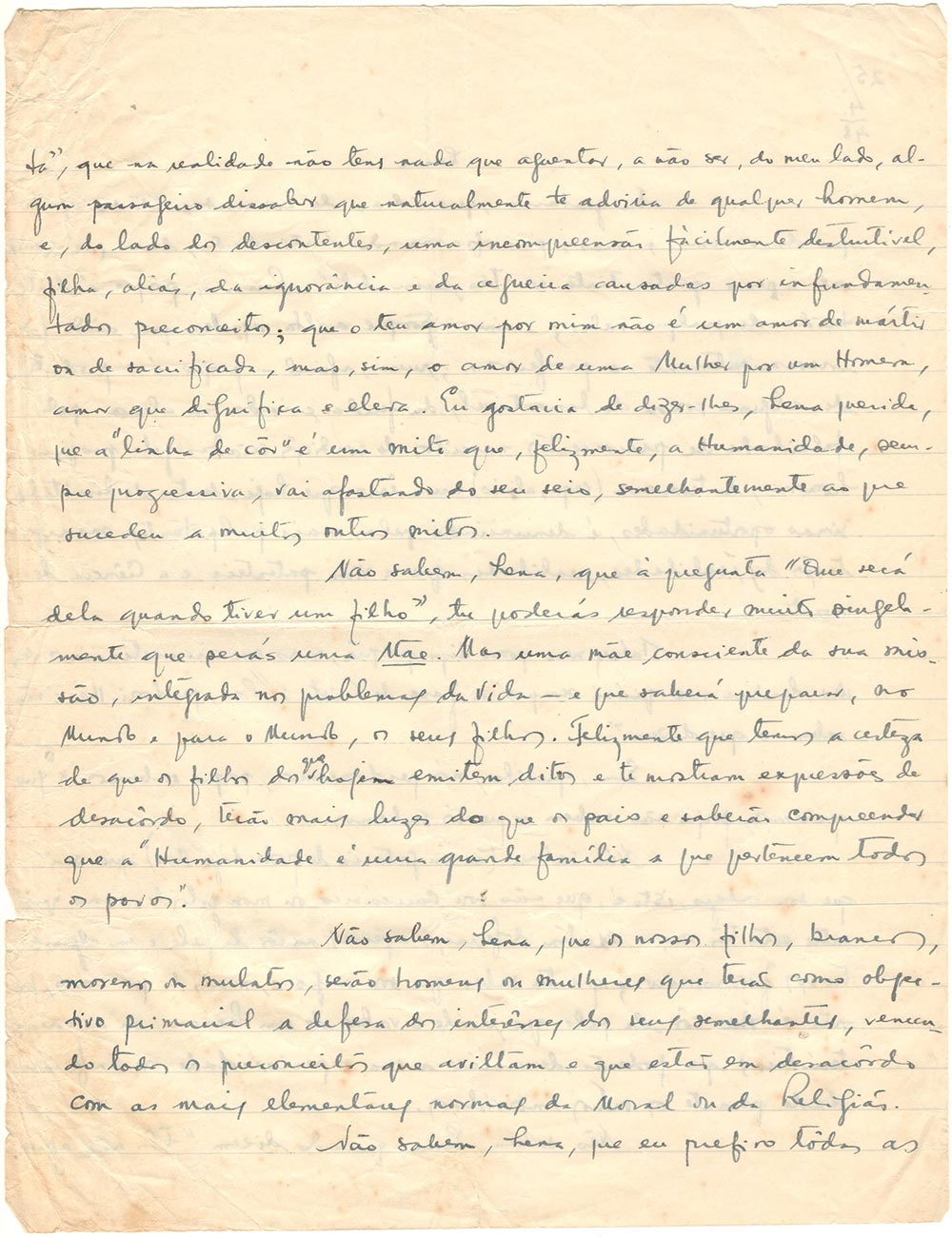 Je pourrais bien sûr analyser ici et de nouveau les causes de l’erreur ou des illusions sur lesquelles reposent ces opinions et t’affirmer que le mythe des races n’est qu’un mythe. Mais je ne le ferai pas. Je ne le ferai pas parce que ce serait une répétition, et la répétition, ici, traduirait de ma part un manque de confiance en toi. Car je pense qu’il est temps de nous montrer fermes dans notre résolution de « cheminer ensemble ». Tu qualifies tout cela de « petits inconvénients de la distance » mais je veux te dire que j’étais absolument certain que la distance n’apporterait aucun inconvénient à notre vie actuelle, si ce n’est celui de la saudade. Il est temps que nous ressentions les choses ensemble, même si nous sommes loin l’un de l’autre. C’est pourquoi je m’abstiens de commenter ce qu’on te dit, sans pour autant cesser de comprendre que tu me le dises. Je ne parlerai pas non plus du fait qu’on me considère comme « vaniteux » ou « prétentieux » (dans mes écrits, mes paroles ou ma manière d’être), car je sais bien (et je pense qu’il est temps que tu le saches aussi) jusqu’où vont ma vanité ou ma modestie. Je ne peux m’empêcher de citer le vieux dicton humoristique : « Laisse-les parler-les... » .