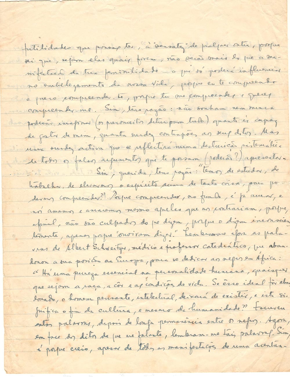 Oui, chérie, tu as raison : « nous devons étudier, travailler, élever notre esprit au-dessus de tant de choses pour pouvoir comprendre ». Car comprendre, au fond, c’est déjà aimer, et nous aimons et aimerons même ceux qui nous contredisent, car, après tout, ils ne sont pas coupables de ce qu’ils disent, parce qu’ils le disent sans conscience, seulement parce qu’ils « l’ont entendu dire ». Cela me rappelle les paroles d’Albert Schweitzer, médecin et professeur titulaire de médecine, qui a abandonné sa position en Europe pour se consacrer aux Noirs en Afrique : « Il existe une pureté essentielle dans la personnalité humaine, quelles que soient la race, la couleur et les conditions de vie. Si cet idéal est abandonné, l’homme pensant, intellectuel, cessera d’exister, et cela signifiera la fin de la culture et même de l’humanité ». Il a écrit ces mots après un long séjour parmi les Noirs. Aujourd’hui, face à ce que tu m’as dit, ces mots me reviennent à l’esprit. Oui, c’est parce que je crois, malgré toutes les manifestations d’un manque flagrant de « délicatesse d’âme », en cette « pureté essentielle de la personnalité humaine », que je ne suis pas troublé par les propos et la désapprobation des grincheux, regrettant seulement de ne pas pouvoir leur parler.