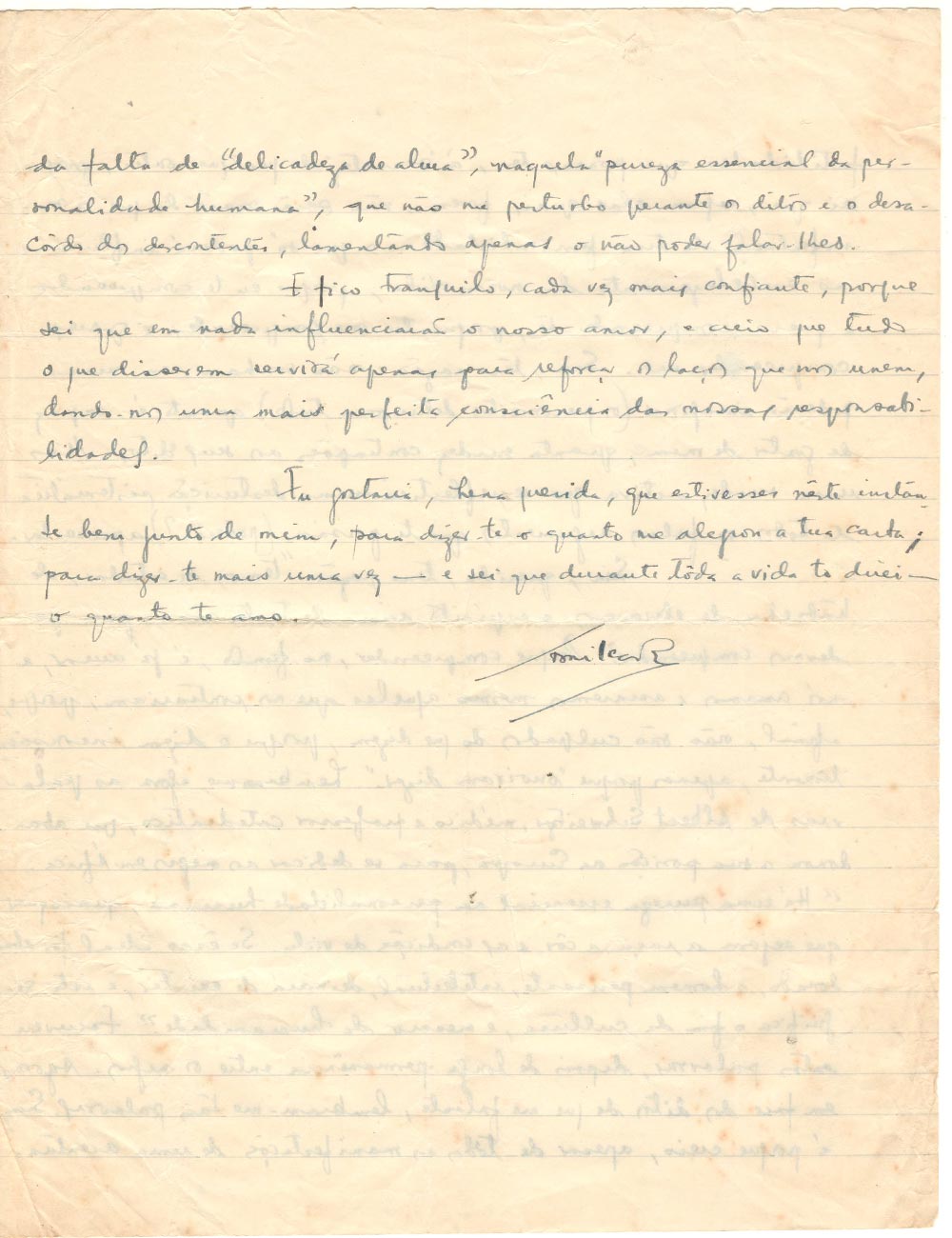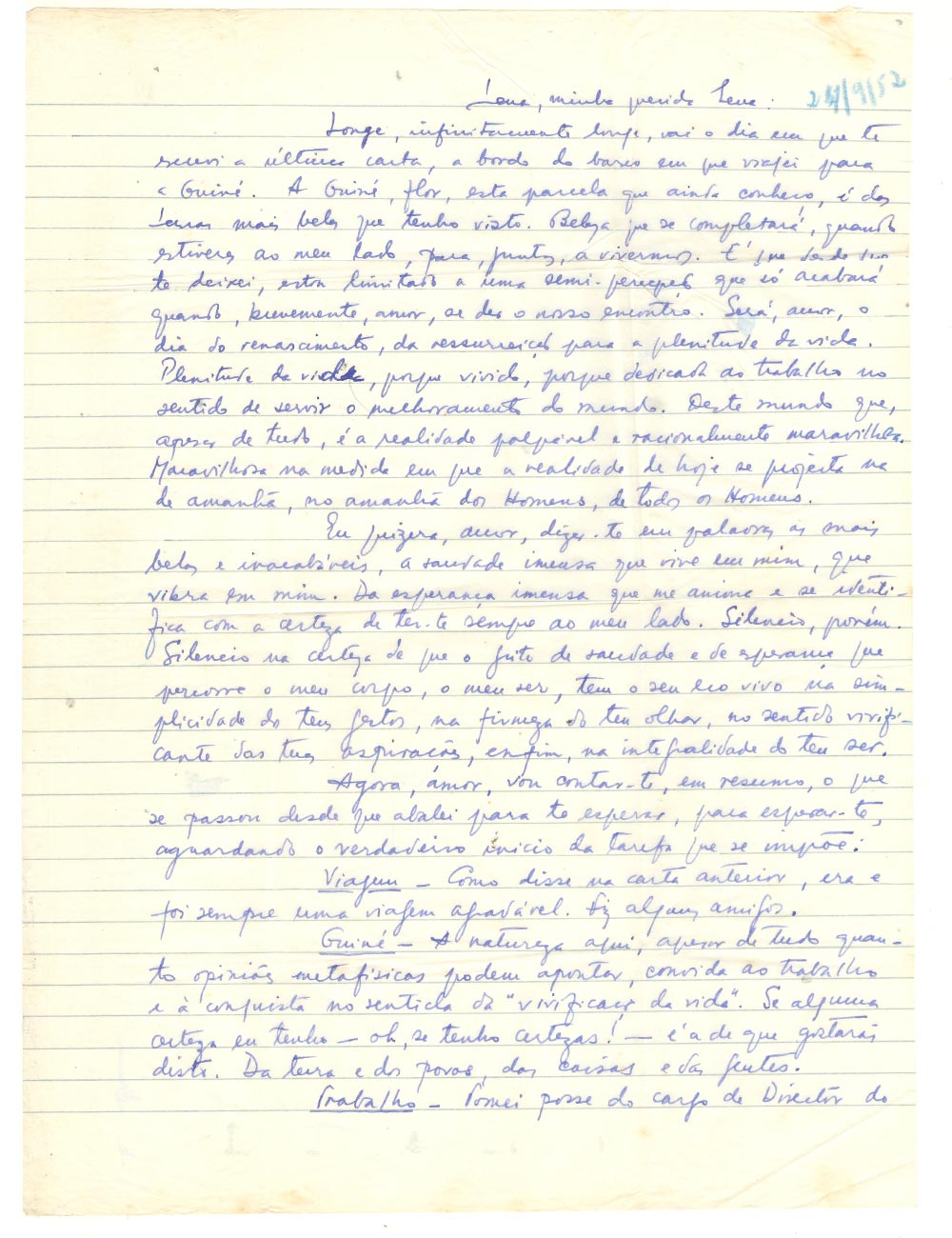 J’aurais voulu, mon amour, te dire avec les mots les plus beaux, des mots infinis l’immense saudade qui vit en moi, qui vibre en moi. De l’immense espoir qui m’anime et s’identifie avec la certitude de t’avoir toujours à mes côtés. Mais silence. Silence dans la certitude que le cri de saudade et d’espoir qui parcourt mon corps, mon être, trouve son écho vivant dans la simplicité de tes gestes, dans la fermeté de ton regard, dans le sens vivifiant de tes aspirations, enfin, dans l’entièreté de ton être.