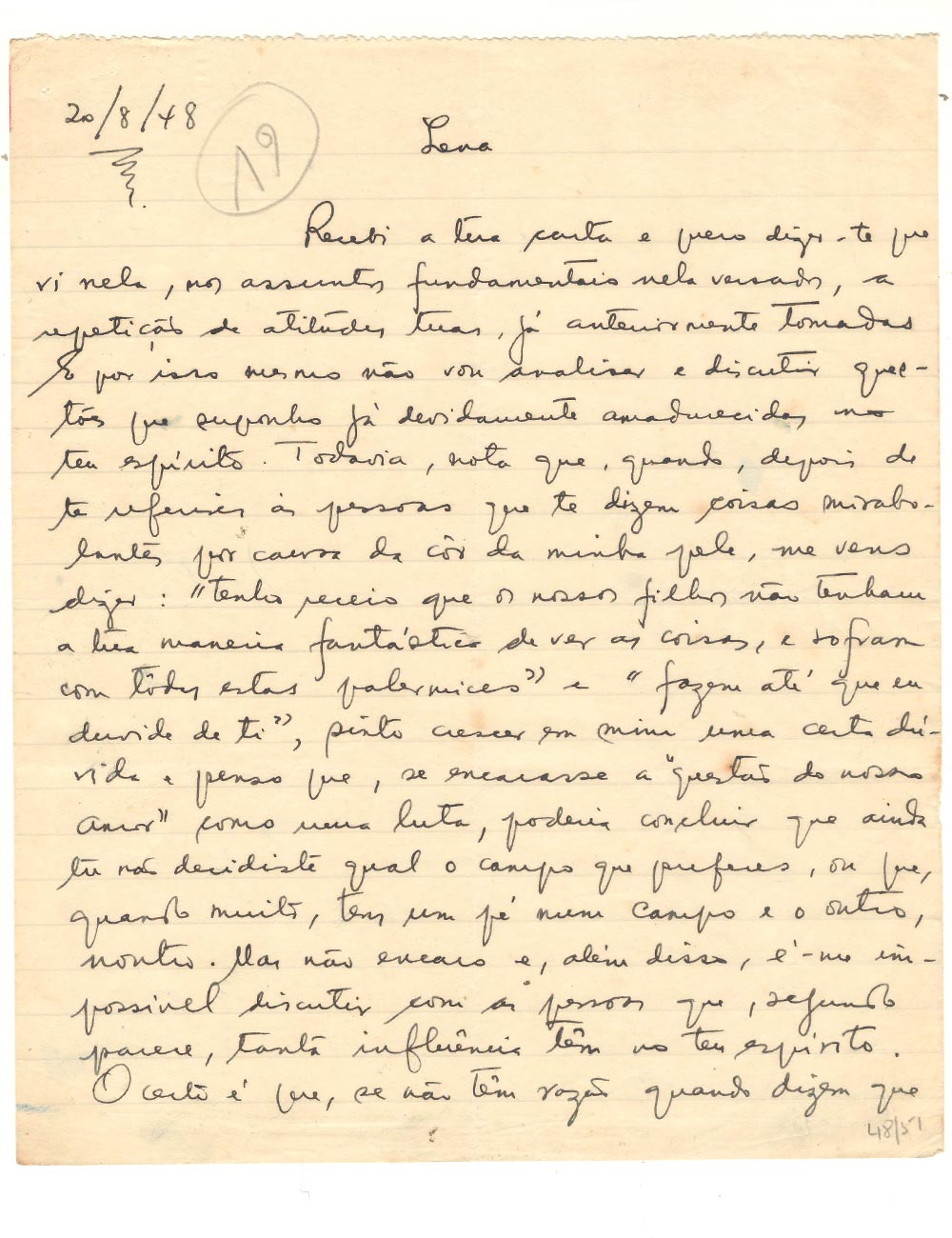 Iva – J’ai passé toute la journée du 19 septembre avec elle et la famille. Iva avait de la fièvre, mais j’espère qu’elle se remettra rapidement. Elle ne pourra pas venir avec toi, mais elle sera à nos côtés à temps pour accueillir Monjói. D’une manière générale, j’ai trouvé les nôtres un peu maigres. Nous ne leur permettrons pas d’avoir d’autres soucis. Non. Fernando, qui est un gentil garçon (il fait très bien du patinage !), viendra avec toi. Tonecas – je vais voir si je peux envoyer de l’argent pour qu’il puisse encore prendre l’« Ana Mafalda ». Il y a de grandes difficultés, mais je ferai tout pour les surmonter. Je t’enverrai un télégramme à ce sujet. Pour le reste, nous nous occuperons de tout à ton arrivée. Oui, nous nous en occuperons.