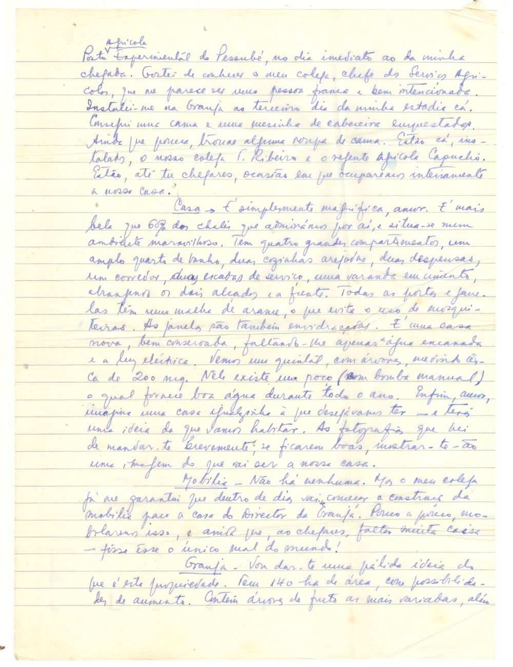 Travail – J’ai pris mes fonctions de Directeur du Poste Agricole Expérimental de Pessubé, le lendemain tout juste de mon arrivée. J’ai été content de faire la connaissance de mon collègue, le chef des Services Agricoles, qui m’a semblé une personne franche et bien intentionnée. Je me suis installé à la Granja le troisième jour de mon séjour ici. J’ai pu emprunter un lit et une table de chevet. J’ai apporté un peu de linge de lit, même si c’est peu. Notre collègue T. Ribeiro et le régent agricole Capucho sont installés ici. C’est le cas jusqu’à ton arrivée, moment où nous occuperons entièrement notre maison.