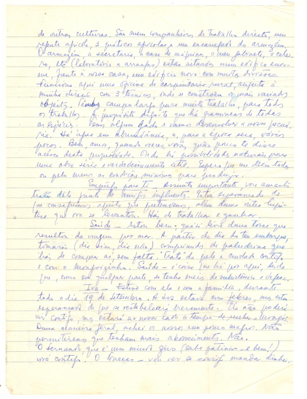 Santé – Je vais bien, je suis presque débarrassé d’une toux contractée pendant le voyage en mer. À partir du jour de ton embarquement, tu prendras (un jour sur deux) des comprimés de paludrine que tu achèteras sur place, sans faute. « Soigne » ta peau et prends soin de toi et du petit Monjoizinho . La santé – c’est une chose qui existe ici, à condition, comme partout ailleurs, d’avoir les moyens de subsistance et de défense.