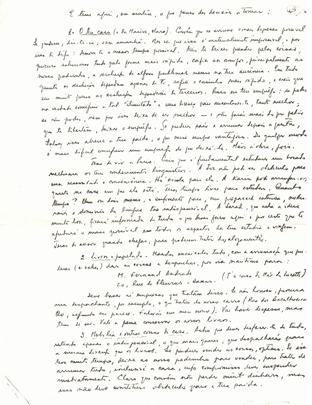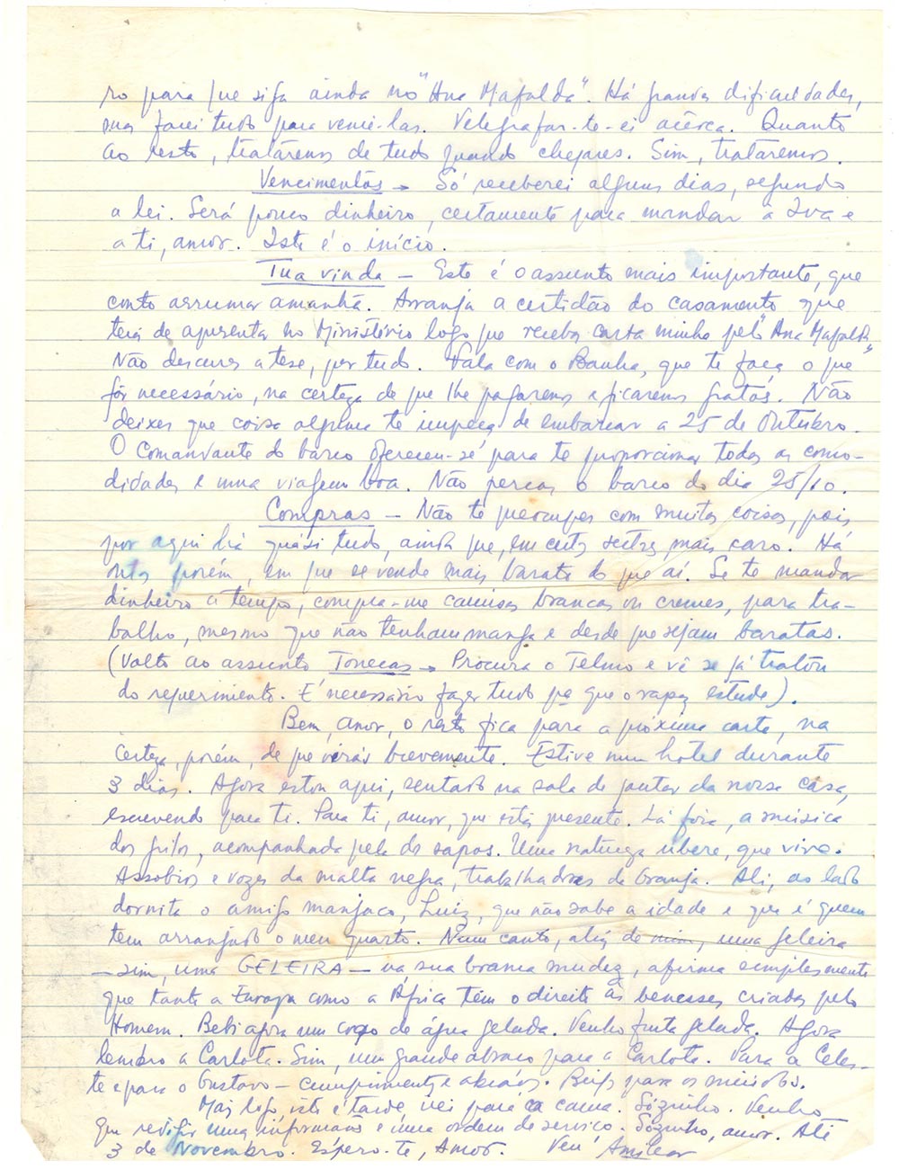 Ta venue – C’est la question la plus importante, que je compte régler demain. Procure-toi le certificat de mariage que tu devras présenter au Ministère dès que tu recevras ma lettre par l’« Ana Mafalda ». Ne néglige pas ta thèse, pour rien au monde. Parle à Banha, qu’il fasse pour toi le nécessaire, nous le lui rembourserons et lui en serons reconnaissants. Ne laisse rien qui puisse t’empêcher d’embarquer le 25 octobre. Le Commandant du bateau s’est offert pour te réserver tout le confort et un bon voyage. Ne rate pas le bateau du 25/10.