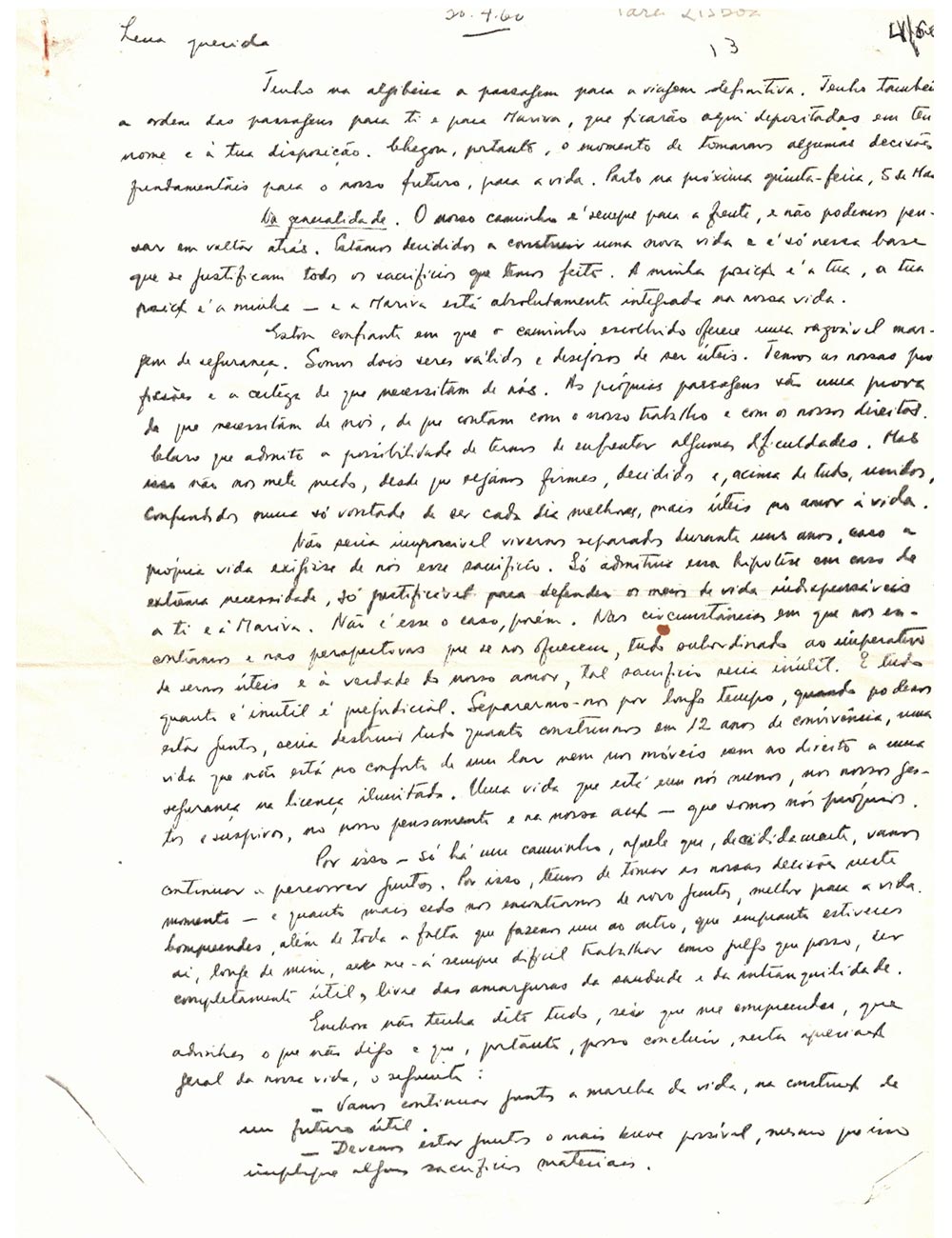 J'ai une bonne fois pour toutes dans ma poche le billet pour le voyage définitif. J’ai également les billets pour Mariva et toi, qui resteront déposés ici à ton nom et à ta disposition. Le moment est donc venu de prendre certaines décisions fondamentales pour notre avenir, pour la vie. Je pars jeudi prochain, le 5 mai.