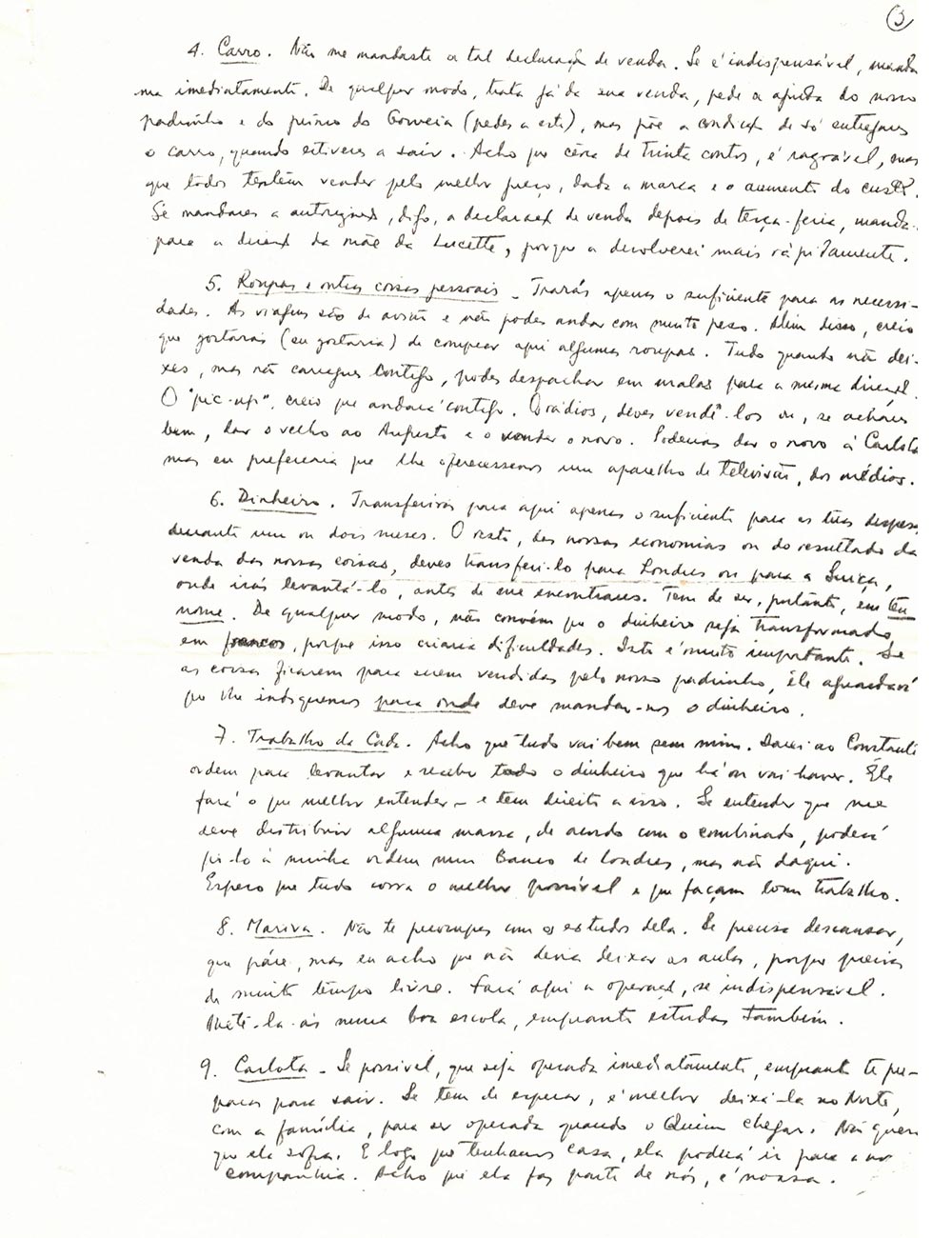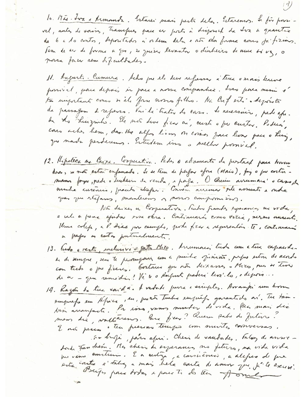 10. Mère Iva et Armanda. Je serai plus près d’elles. Nous le serons. Si possible, avant de partir, transfère à Iva la somme de 6 à 10 « contos », déposée à son ordre et non comme nous l’avons déjà fait. Il faut que ce soit de manière à ce que, si elle veut retirer l’argent en une seule fois, elle puisse le faire sans difficulté.